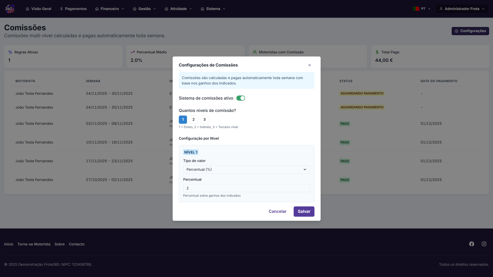Sistema avançado de comissões em cascata. Configure percentuais por nível (N1, N2, N3+). Cálculo e pagamento automático. Incentive motoristas a expandir a sua rede.