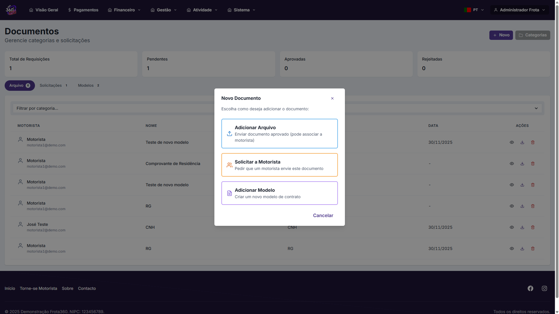 Cadastro completo com todos os dados, documentos e histórico. Controle afiliados e locatários. Associação com veículos, status configurável e acompanhamento de desempenho individual.