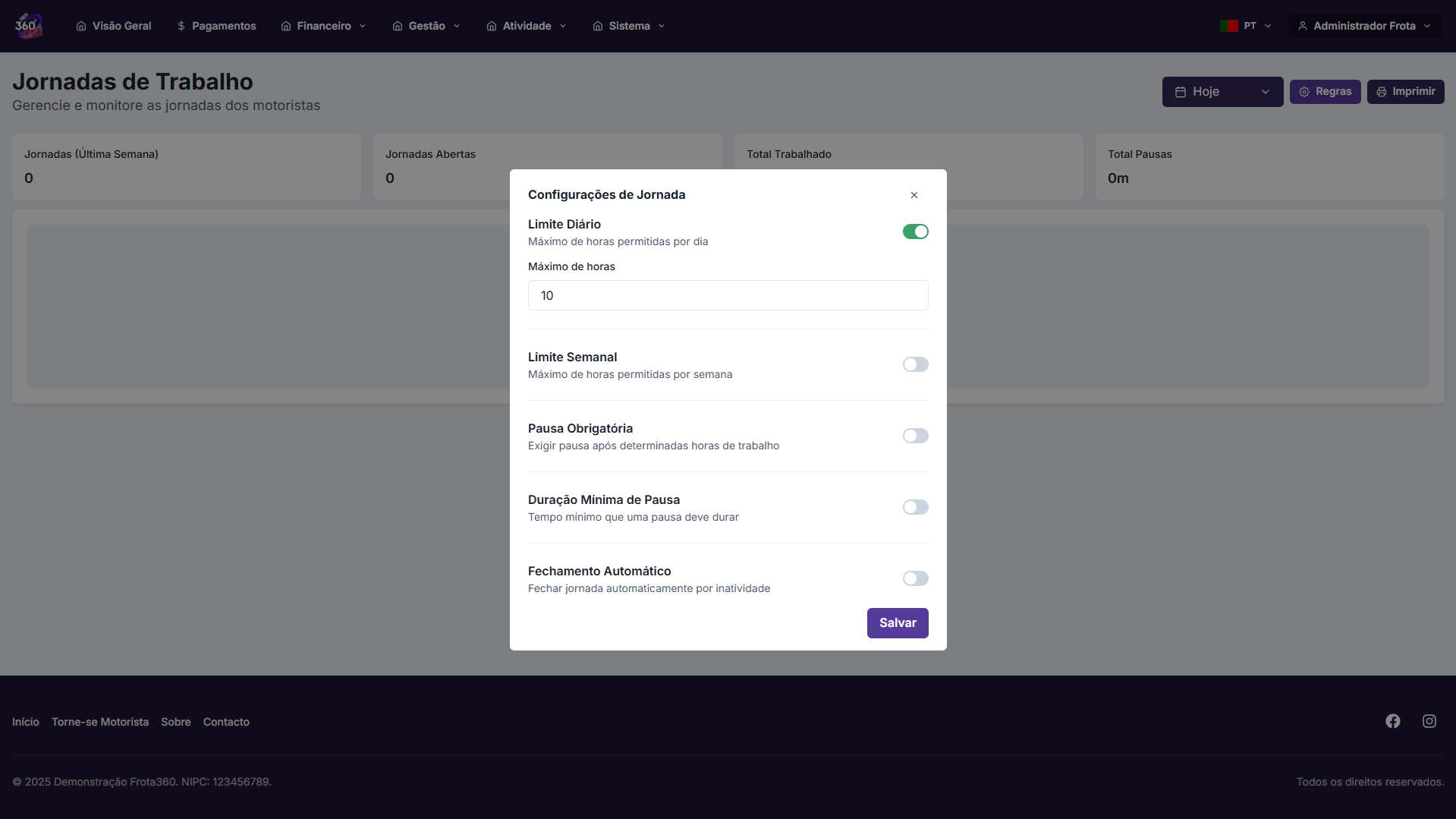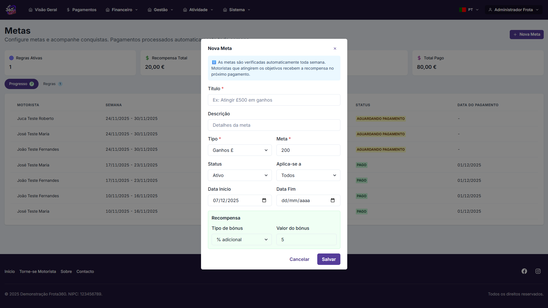 Defina metas de faturamento individuais ou por equipa. Motoristas acompanham progresso em tempo real. Bónus creditado automaticamente quando meta é atingida.