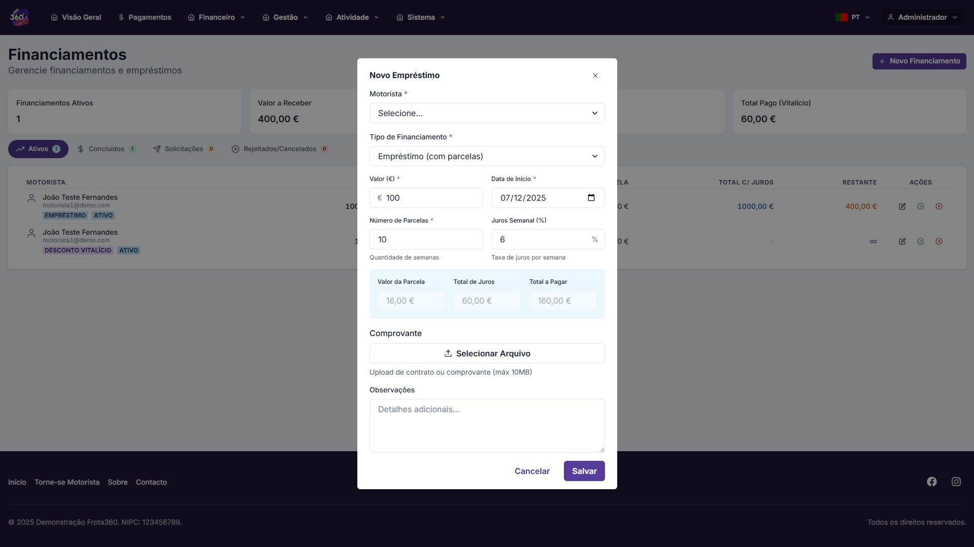 Gira pedidos de adiantamento com aprovação rápida. Configure parcelas e juros (opcional). Desconto automático nos pagamentos semanais com controlo total do saldo devedor.