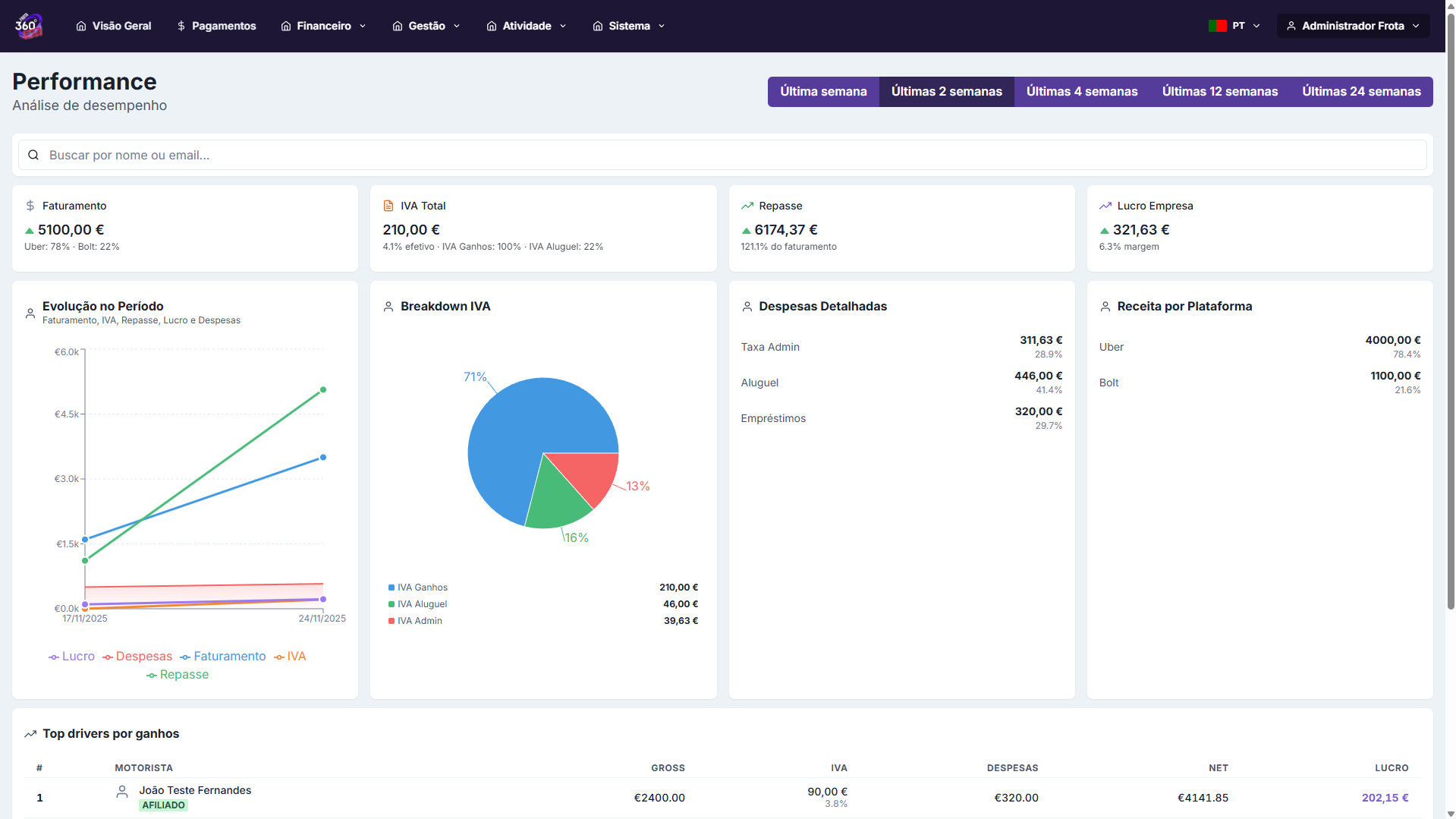 O núcleo do sistema. Sincroniza dados da Uber, Bolt, Via Verde, MyPRIO e outras plataformas. Consolida faturamento bruto, calcula comissões por tipo de motorista, aplica bónus de metas e indicações, desconta parcelas de adiantamentos, adiciona reembolsos aprovados e gera o valor líquido a pagar.
