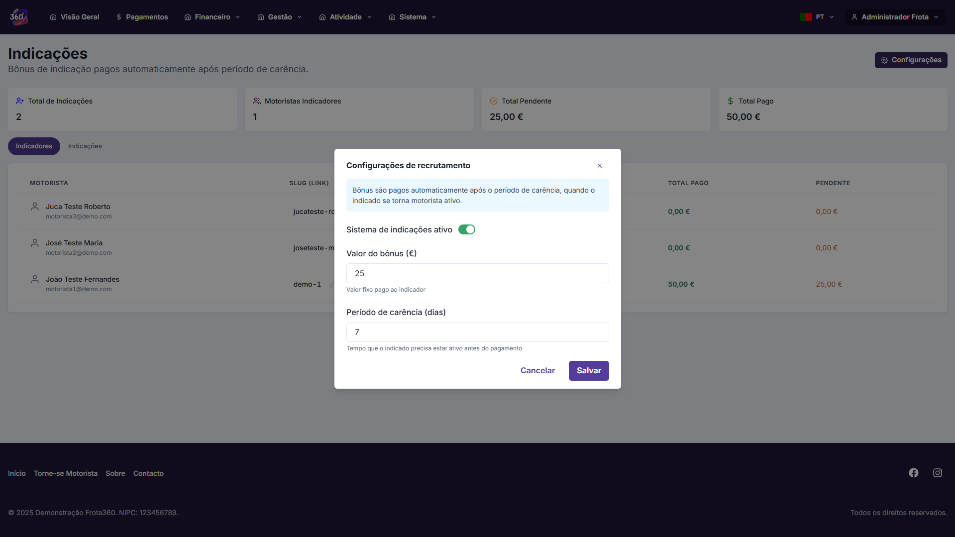 Sistema de afiliados para crescimento orgânico. Cada motorista tem link exclusivo. Configure valores de bónus e critérios. Pagamento automático após aprovação.