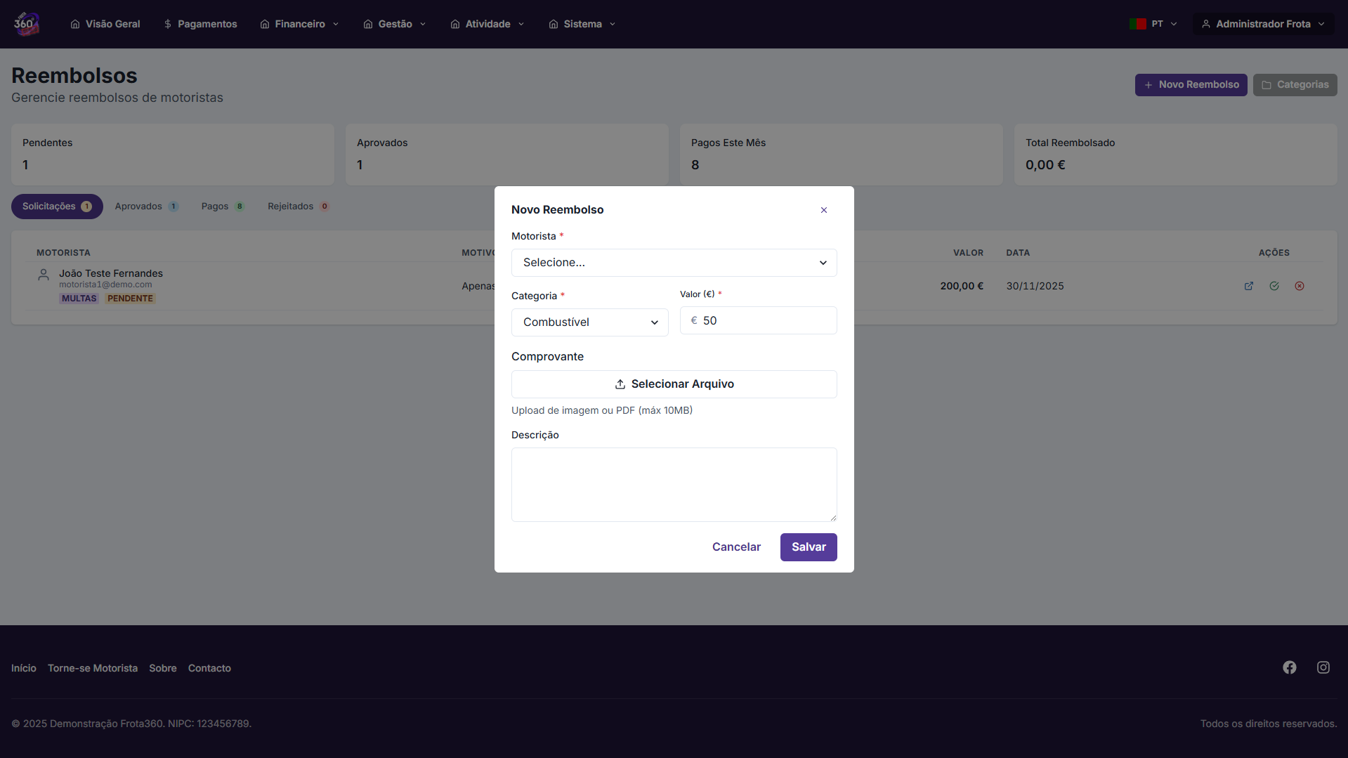 Fluxo completo para pedidos de reembolso: solicitação pelo motorista, validação de comprovantes, aprovação e crédito automático no próximo pagamento.